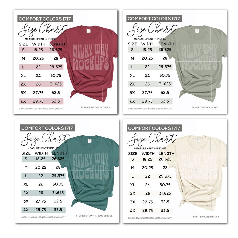 A bundle of 4 (four) digital Sizing Charts for the Comfort Colors 1717 garment-dyed t-shirt.
