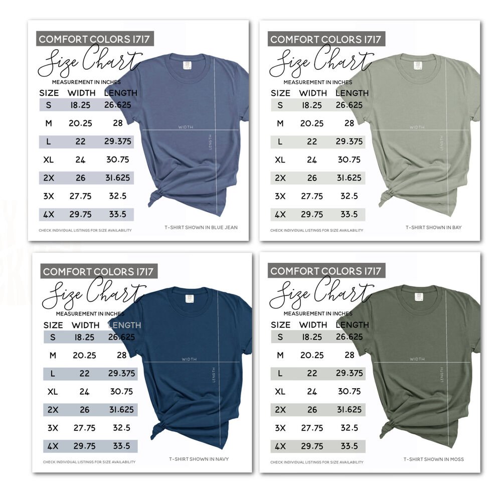 A bundle of 4 (four) digital Sizing Charts for the Comfort Colors 1717 garment-dyed t-shirt.